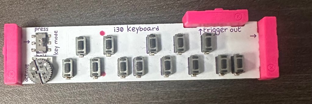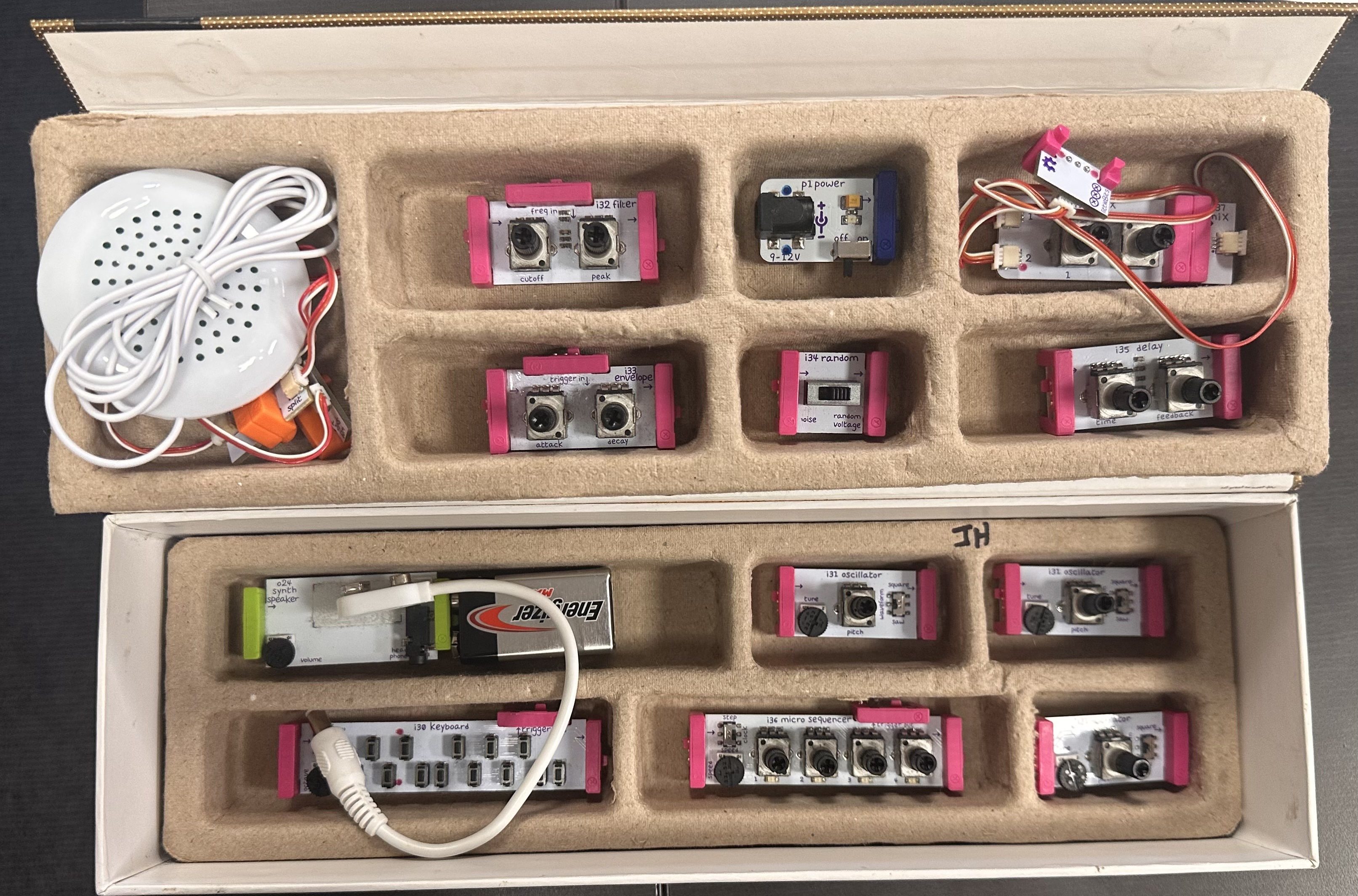 For today’s lesson, James spiced things up a bit as we came into class and were given no instructions; instead, he signaled for us to go to one of the three egg cartons on the tables and start “tinkering musically.” Inside these egg cartons was an arrangement of little circuits, each with a label on it describing its function. In our groups, we read the instructions on how to connect each brick to create a sound, making sure we put them in the correct order. After everyone had a turn creating a sound that seemed like it was trying to contact aliens, James gathered the class around to discuss how an 8-volt battery, some circuits, and a speaker could produce this weird and wacky sound. The key to understanding how synths create a sound lies within VCOs or voltage-controlled oscillators. In basic terms, an oscillator converts direct current (DC) into alternating current (AC); this process creates different types of recurring waves that, once amplified, produce that iconic synth sound. By adding different signals or filters such as envelopes, LFOs, or sequencers, we can modulate this sound. After James explained this, probably in a much better way than my attempt, we moved to the program Soundtrap on our laptops to see how the same activity we just participated in could be replicated virtually.